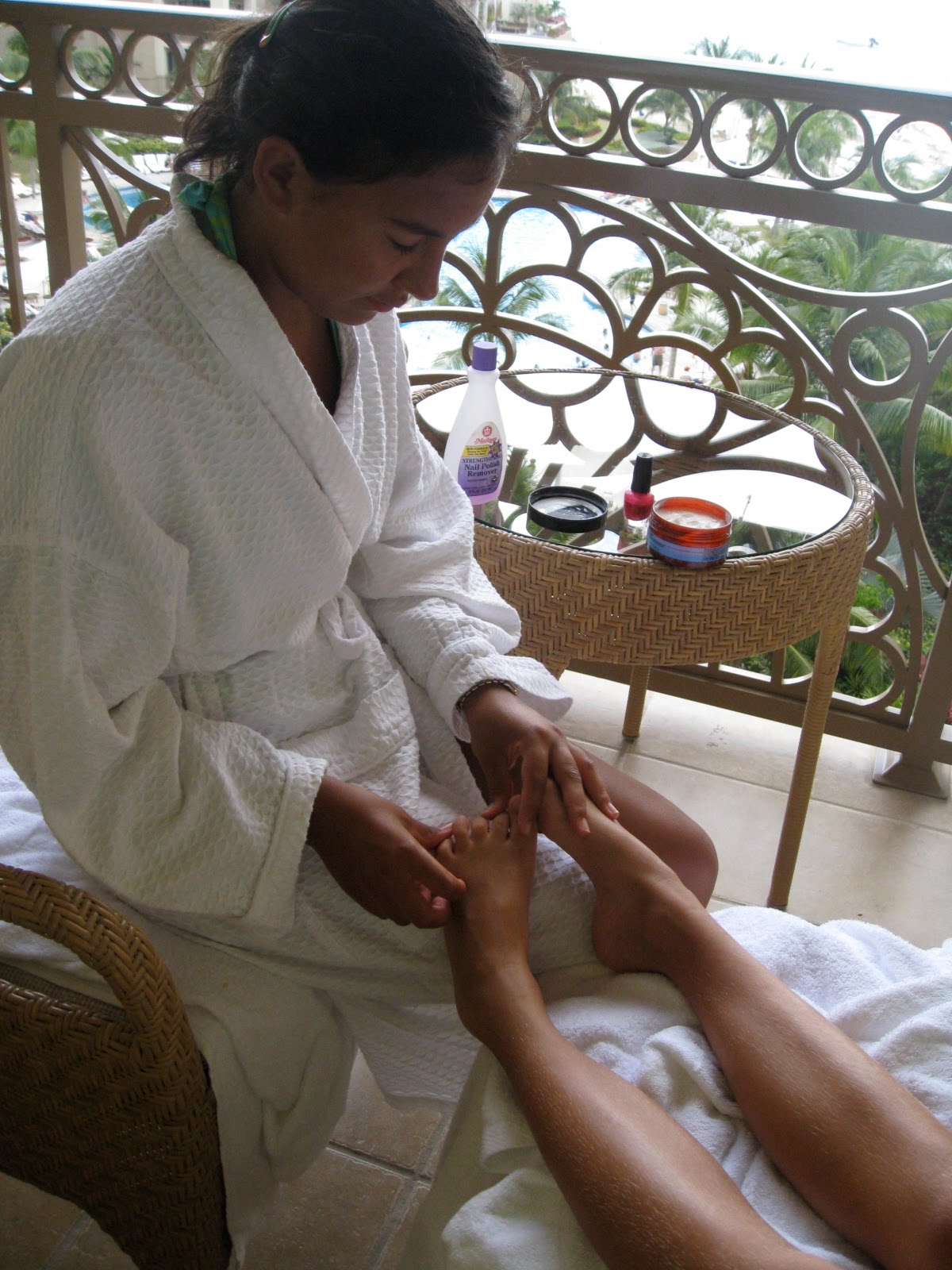 The girls decided to have a spa day one afternoon. We had a bunch of Ritz Carlton robes and so the girls got "dressed" and did some homemade facials. They looked up on the internet some recipes and we just happened to have the ingredients on hand. Here's Mari...